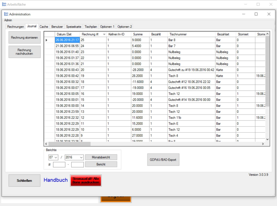 ![]() Abrechnungen. Für Kellner(innen) druckt der Knopf "Abrechnung des aktuellen Benutzers" den Tagesumsatz des Kellners aus. Bei Kassenschluss wird bei Druck auf "Tagesabschluss (alles abrechnen)" der gesamte Tagesumsatz abgerechnet. ![]() Das Journal enthält alle Rechungen, Stornos und sonstigen Belegarten. Hier können Monatsberichte erstellt werden oder auch im Zuge einer Kontrolle die Kassendaten auf externe Datenträger exportiert werden. Mit einem Druck auf "DEP-Export" wird das Datenerfassungsprotokoll auf einen Datenträger freier Wahl exportiert. Ein Druck auf "BAO/GdpDU -Export" exportiert die Datenbank-Tabellen "Journal" (alle jemals gebuchten Belege) sowie die Tabelle "Journaldetails" (die einzelnen abgerechneten Artikel) in den Backupordner von BonBon. Achtung: Ein solcher Export kann bis zu 20 Minuten dauern! |