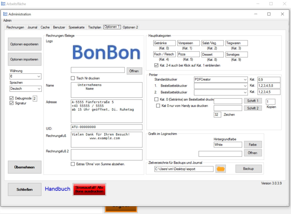 Texte wie Adresse, UID-Nummer, Veranstaltungshinweise auf den gedruckten Bons und Rechnungen können unter Admin -> Optionen (s. Abb. FIG(optionen)) angepasst werden. Weiters gibt es 2 Bilder zu konfigurieren: