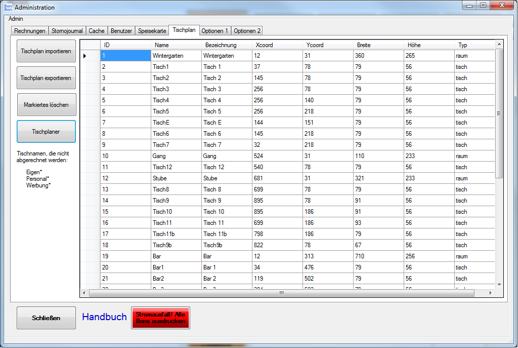 2: Die Tischnamen "Werbung" "Personal" und "Eigenverbrauch" sind reserviert: Sie werden trotz Abrechnung nicht zum Umsatz gezählt, sondern werden bei Tagesabschluss extra angeführt. ![]() Der Raum- und Tischplan kann unter Admin -> Tischlan angepasst, exportiert oder importiert werden. |
