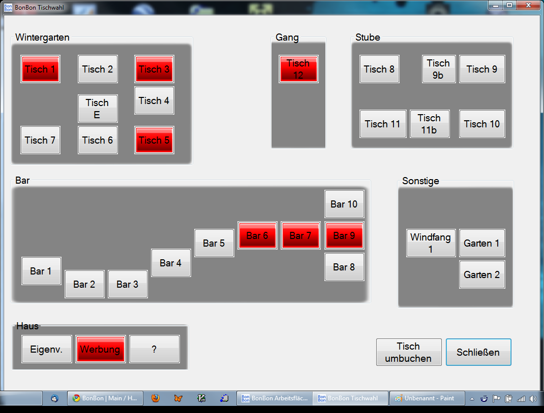Rot markierte Tische sind belegt. Graue Tische sind frei. In der Administration kann jedem Bediener eine eigene Farbe zugewiesen werden. Ein Druck auf den Tisch wählt ihn aus. Das Tisch-Umbuchen geschieht ebenfalls hier. Sie haben 2 Listen. Links sind belegte Tische, rechts sind freie Tisch angezeigt. Den Ursprungs-Tisch markieren, den neuen Tisch markieren, und auf "Umbuchen" klicken. Der Bon des neuen Tischs wird in der Arbeitsfläche angezeigt. (s. Abb. FIG(tischplan)) ![]() Tischplan für Auswahl der Tische. |