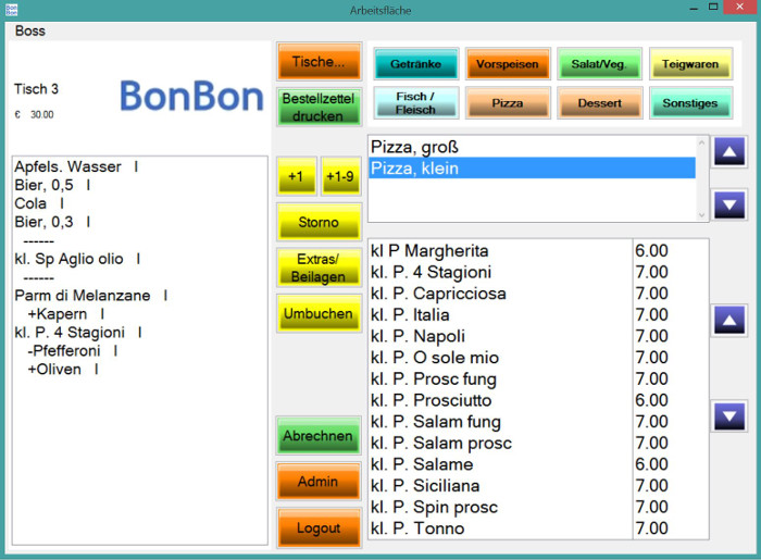 "Bierzettel" wurden und werden verwendet um in der Küche Bestellungen aufzugeben und auch um Konsumationen der Gäste anzuzeigen. Das System mit der Stricherliste ist ein bewährtes, weshalb es auch in BonBon übernommen wurde. ![]() BonBon Tischansicht. Bestellungen werden getippt und ein Zettel für die Küche ausgedruckt. In großer und lesbarer Schrift, damit auch bei Hochbetrieb die Bestellungen in der Küche schnell bearbeitet werden können. Die Kernfunktionen: